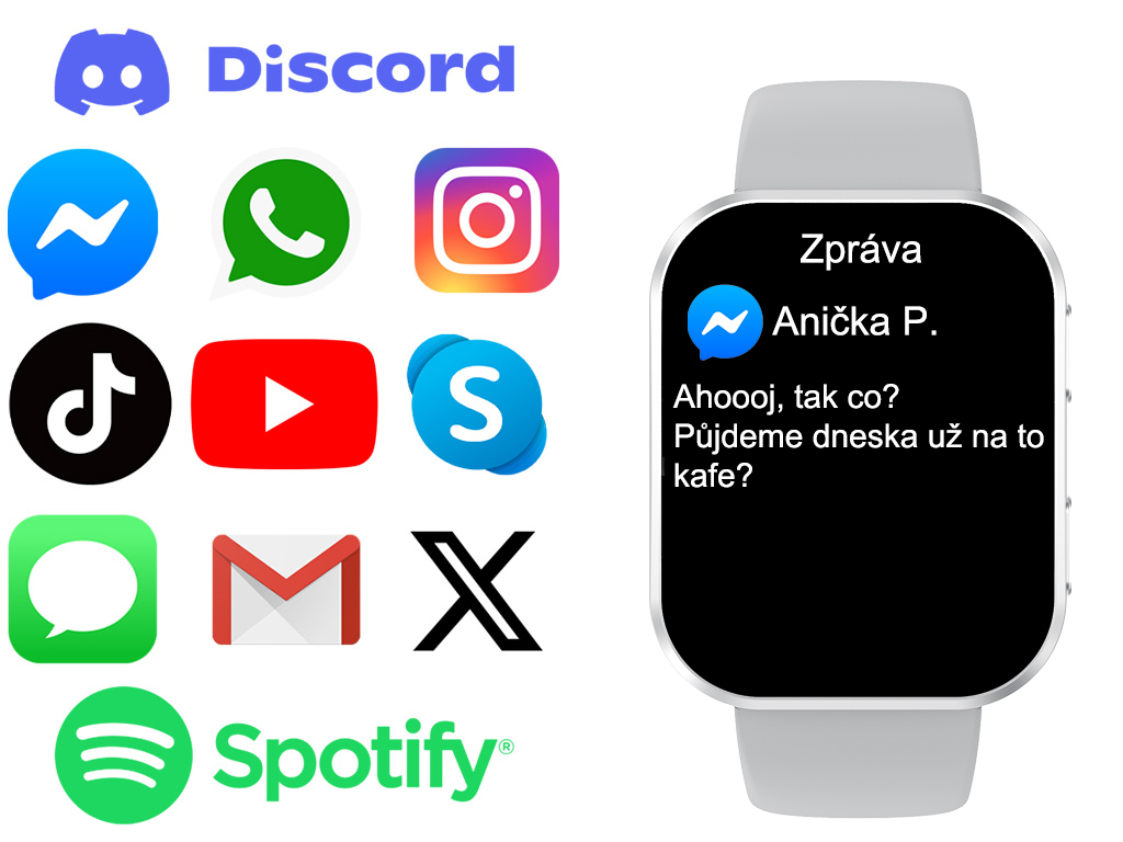 - Powiadomienie: połączenia przychodzące, SMS, aplikacje (Facebook, Messenger, Instagram, TikTok, e-maile i wiele innych…), cykl fizjologiczny dla kobiet.